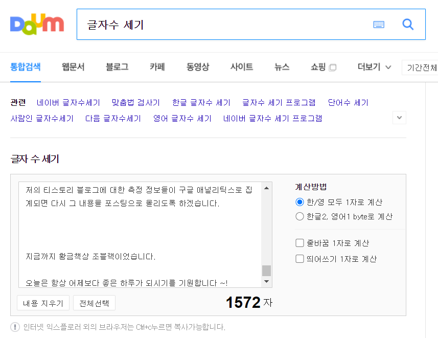 다음 글자수세기에서 계산방법을 한/영 모두 1자로 계산하고 줄바꿈과 띄어쓰기를 모두 글자수 세기에 반영하지 않는 경우에 앞 서 이용했던 다른 글자수 계산 프로그램과 마찬가지로 1572자라는 계산결과를 보여줍니다.