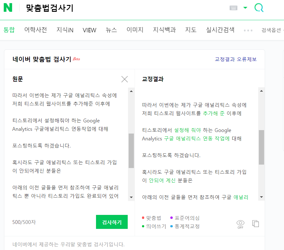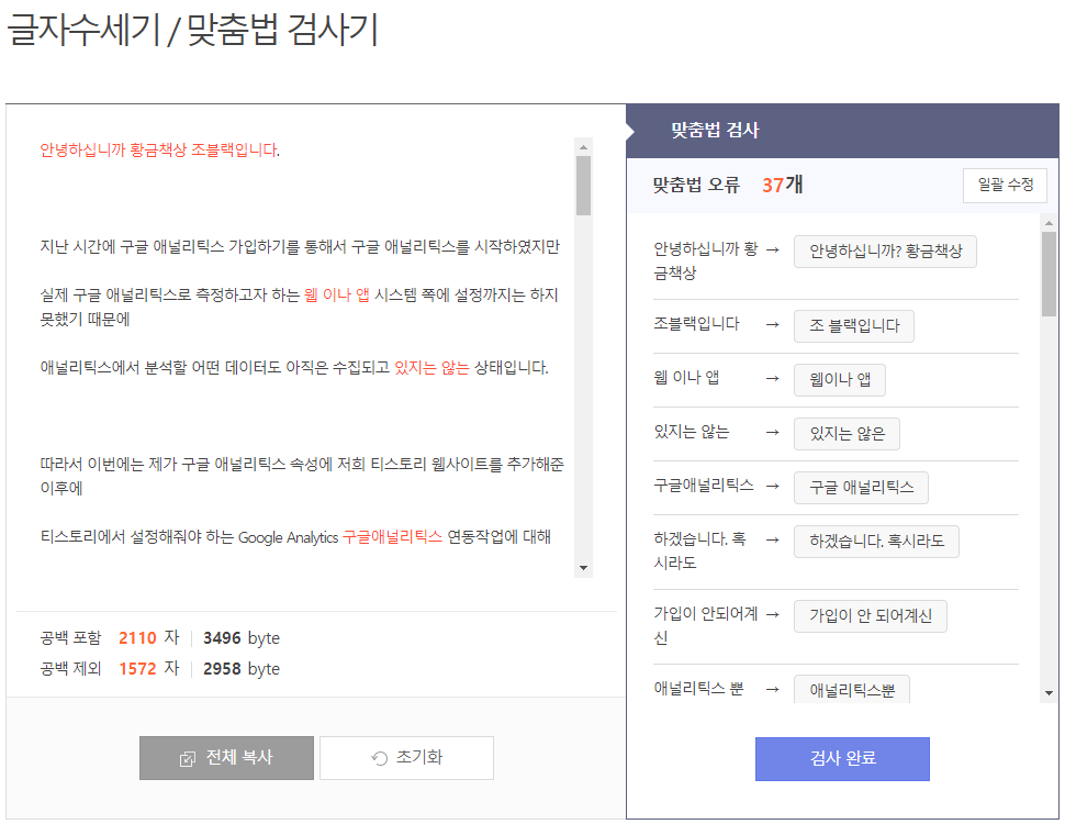 다시 본문을 입력해주고 하단의 '검사하기' 버튼을 눌러주셔야 맞춤법 계산이 됩니다.
