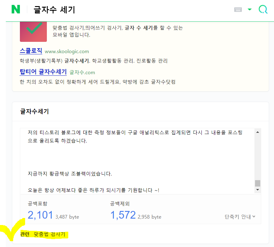 위에 보시는 것 처럼 네이버 글자수세기의 경우에 글자수 계산 결과의 바로 아래쪽에 관련 "맞춤법 검사기"로
