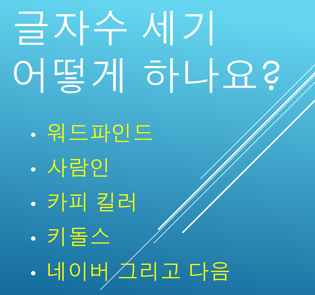 - 워드파인드 : 단어수, 글자수(공백 포함 또는 제외), 줄수, 문장수