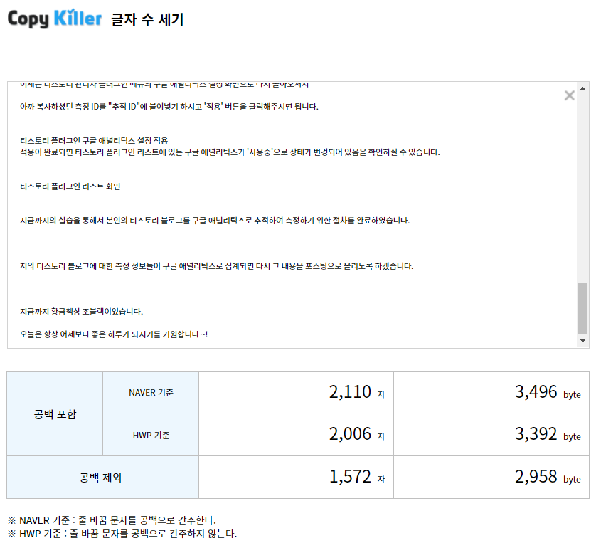 앞 서 사용한 내용과 동일한 포스팅 전체를 카피 킬로 글자수 계산기에 입력한 후에 글자수 계산을 해보았습니다.