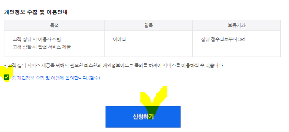 필수항목의 입력을 모두 하고 아래쪽에 있는 "개인정보 수집 및 이용안내"의 체크박스 까지
