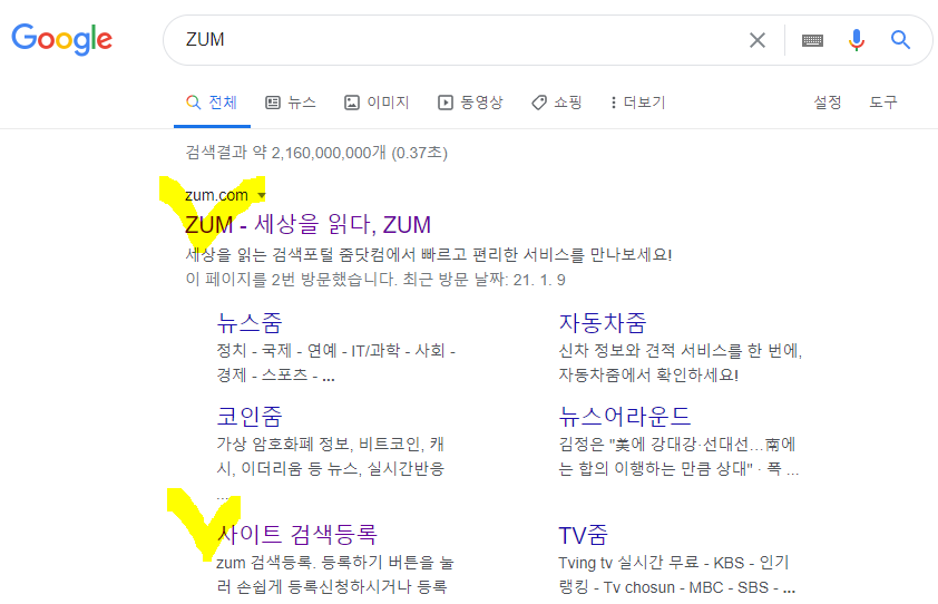 ZUM zum.com 사이트가 조회됩니다. 바로 클릭해서 들어가시거나 좀 더 아래에 있는 '사이트 검색등록'으로 바로 들어가시면 됩니다.