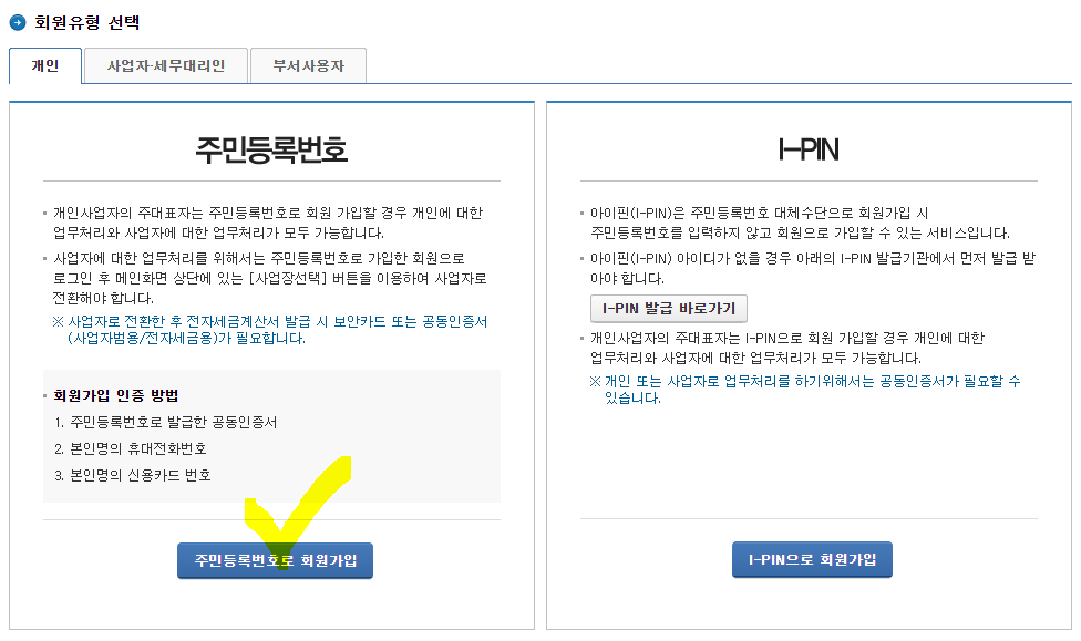 국세청 회원유형을 개인으로 선택하면, 회원가입 유형이 두 가지가 있습니다.