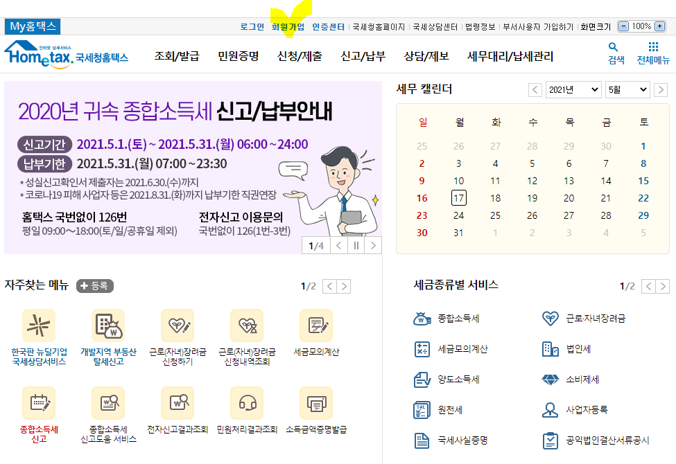 국세청 홈택스에 개인 회원으로 홈페이지 회원가입을 하고 로그인 해서 종합소득세 신고를 포함해서 어떤 기능들이 제공되고 있는지 확인해보고자 합니다.