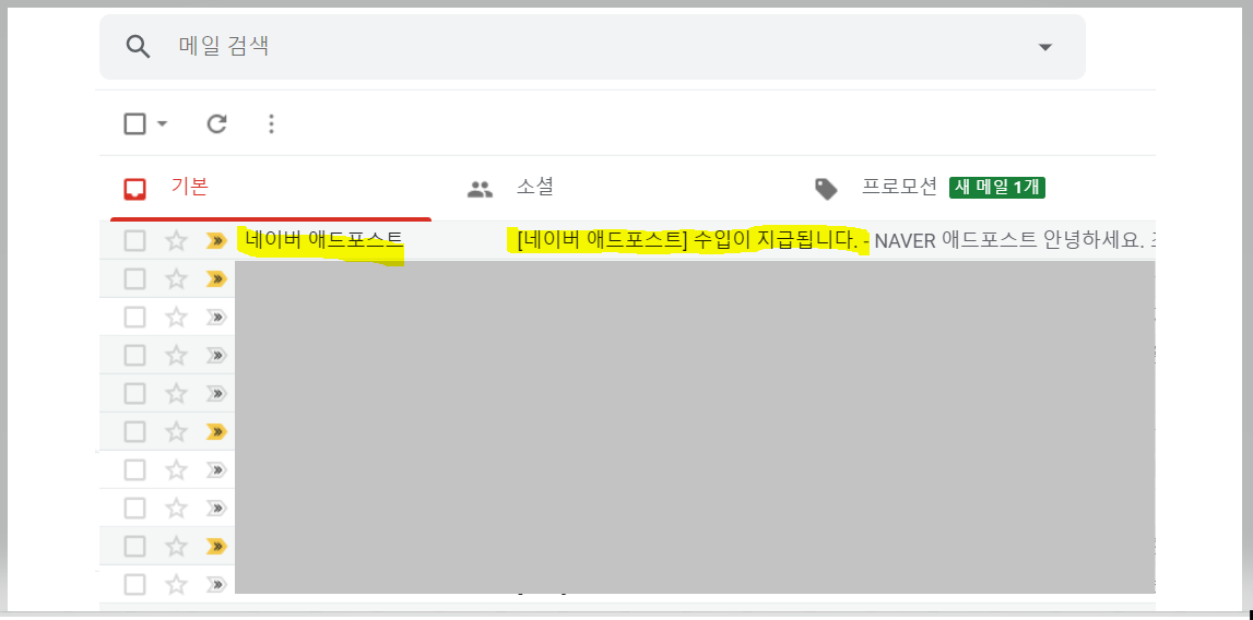 제 이메일 수신함에 도착해있는 네이버 애드포스트의 [네이버 애드포스트] 수입이 지급됩니다. 라는 이메일이 수신함 메일 리스트에 보입니다.