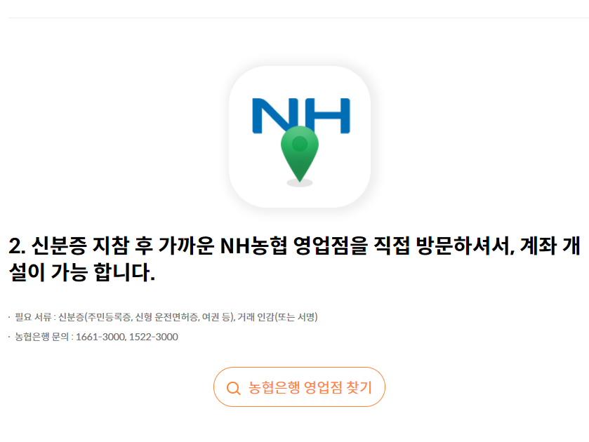 - NH농협 영업점을 직접 방문하셔서 계좌 개설하는 방법입니다.