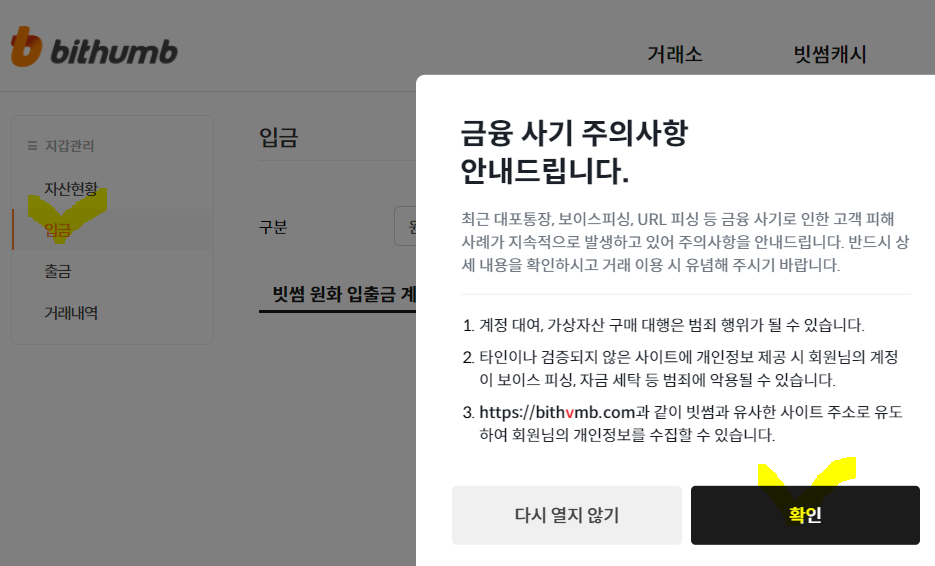 - 빗썸 원화 입출금 계좌번호 신청 --> 클릭