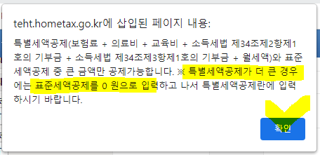 표준세액공제 또는 특별소득공제 중 1가지만 입력하시기 바랍니다.