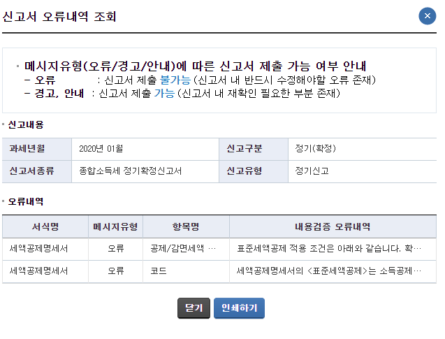 종합소득세 신고서 작성 완료 단계 오류 내역