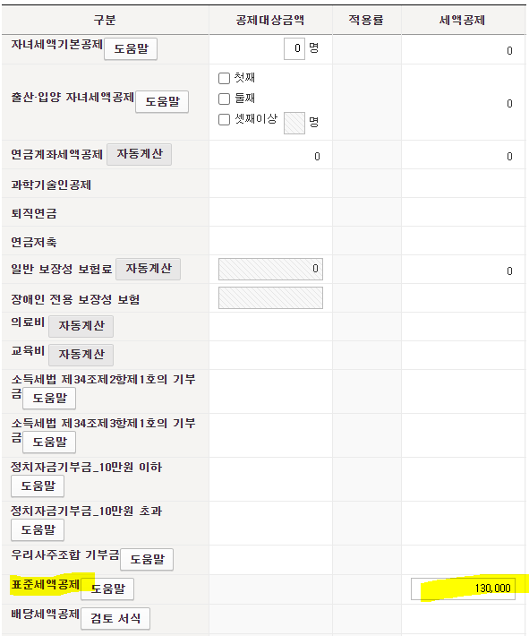 만약 아래 화면 예시와 같이 표준세액공제 항목의 값이 130,000원이 자동으로 조회(13만 원, 12만 원 또는 7만 원 등 표준세액공제 조건에 따라 다름)가 된다고 하면 해당 금액을 0으로 수정하고 저장해야 오류가 발생하지 않는다.
