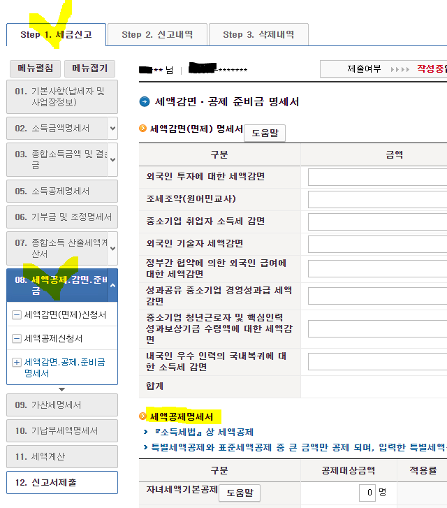 1. Step 1. 세금신고 08. 세액공제, 감면, 준비금 메뉴