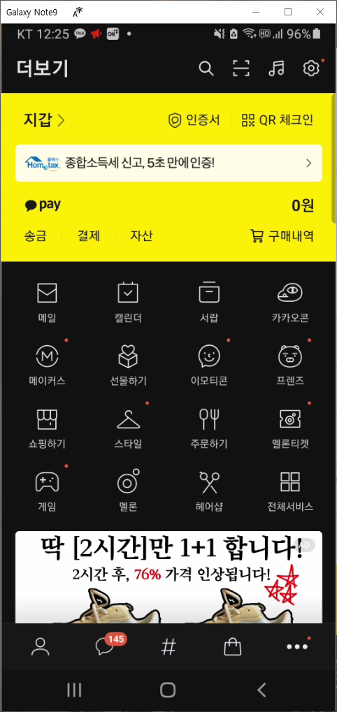 그럼 우선 카카오톡 더보기를 클릭해보겠습니다. "더보기" 탭(Tap)은 (...) 처럼 생긴 아이콘입니다.