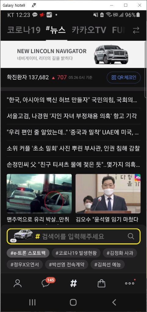 아래의 화면은 각각 #뉴스, 쇼핑 및 더보기 탭(Tap)을 클릭했을 때의 화면입니다.