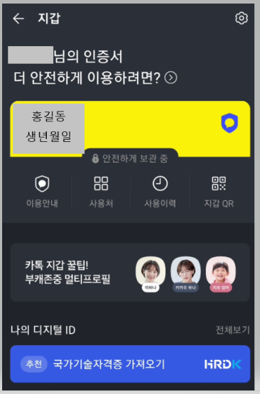 카카오톡 지갑은 인증서를 포함해서 디지털 ID, 멀티 프로필 등이 담겨있는 온라인 지갑이라고 생각하시면 됩니다.