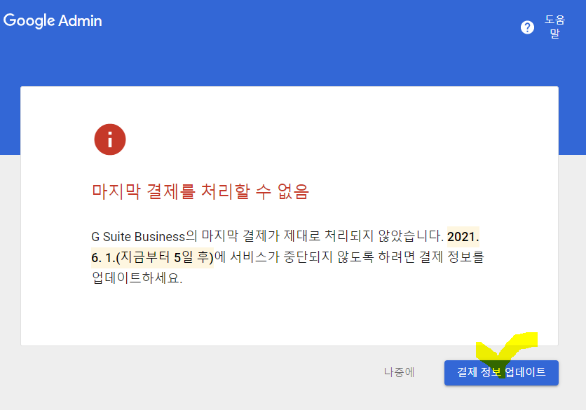 구글 어드민 Google Admin 로그인 시 바로 "마지막 결제를 처리할 수 없음"이라는 안내 문구의 화면을 만나게 됩니다.
