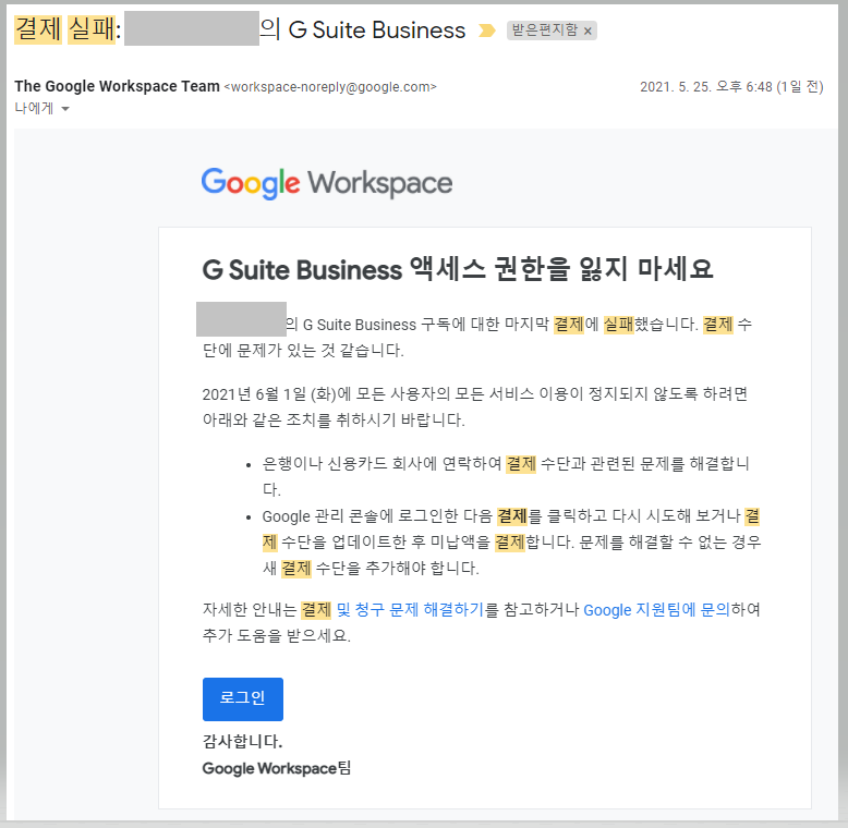 [제가 사용하고 있는 도메인] 의 G Suite Business 구독에 대한 마지막 결제에 실패했습니다.