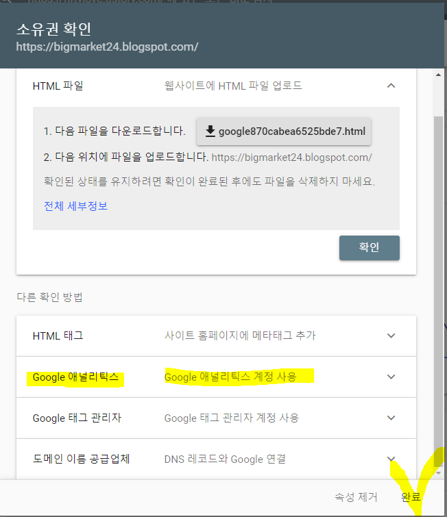 상기의 과정을 통해 구글 블로그와 구글 애널리틱스가 서로 연동되었기 때문에 구글 서치 콘솔의 소유권 확인 화면에서는 이제 비로서 "완료" 버튼을 클릭하여 마무리를 할 수 있게 되었습니다.