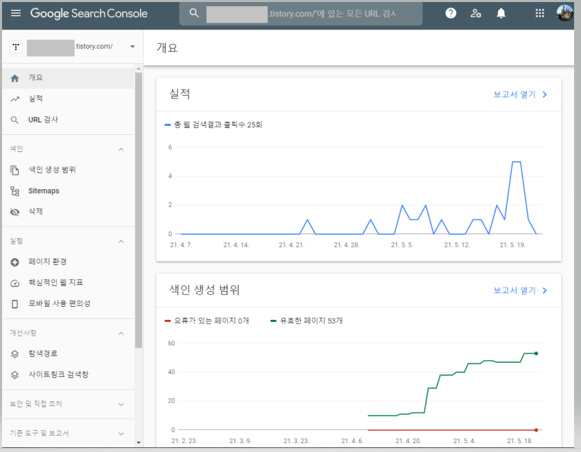 저의 경우 티스토리 블로그가 운영중이기 때문에 구글 서치 콘솔 로그인시 해당 정보가 먼저 보이게 됩니다.