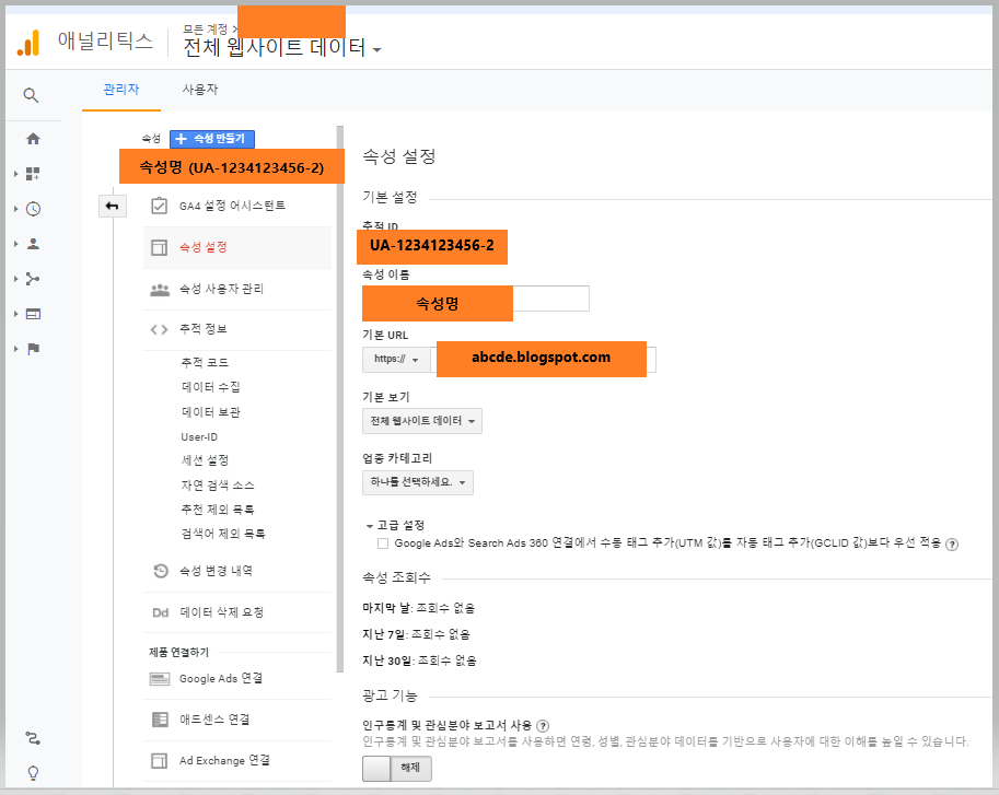 ※ 본 포스팅에서는 이미 해당 구글 블로그에 해당되는 구글 애널리틱스 속성 정보를 생성했다고 가정하고 설명드리고 있습니다.