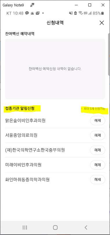 최대 5개 접종기관 까지는 알림 신청이 가능합니다.
