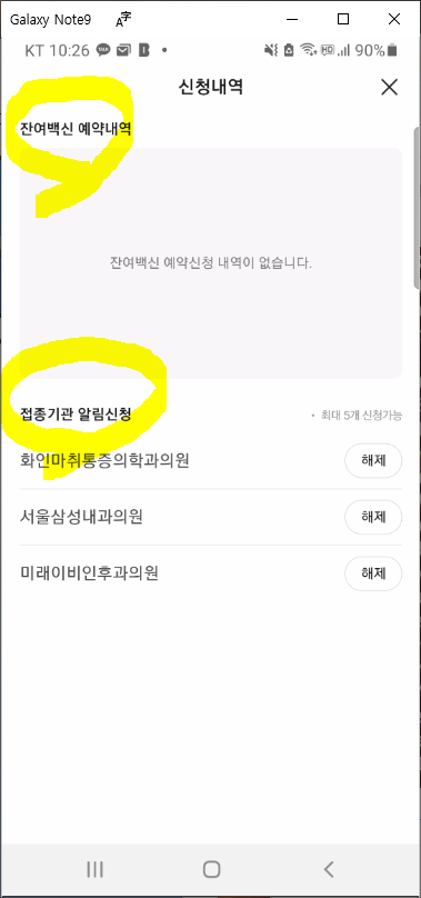 그럼 접종기간 알림 신청의 내용을 보겠습니다. 아래 화면에 보이시는 내용처럼 5개 병원에 알림신청을 해두었는데요