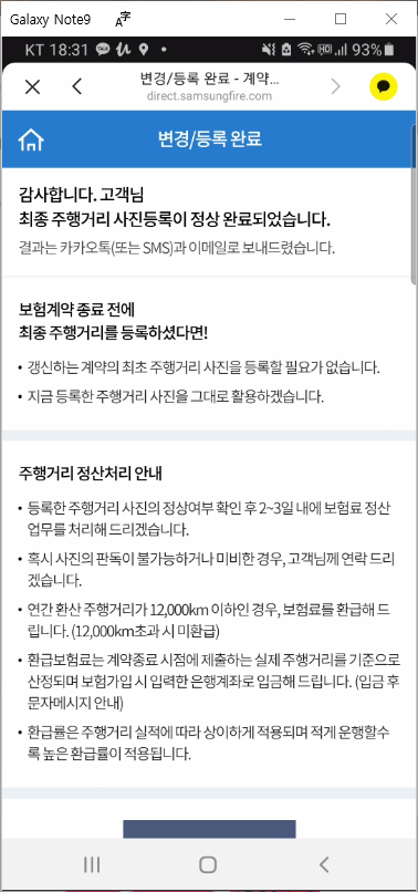 - 등록한 주행거리 사진의 정상여부를 확인하여 2~3일 내에 보험료 정산업무를 처리한다고 합니다.