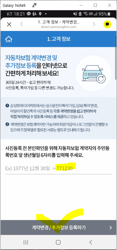 사진등록 전 본인 확인을 위해서 주민등록번호 앞 생년월일 6자리를 입력하고, "계약 변경/추가 정보 등록하기"를 클릭합니다.