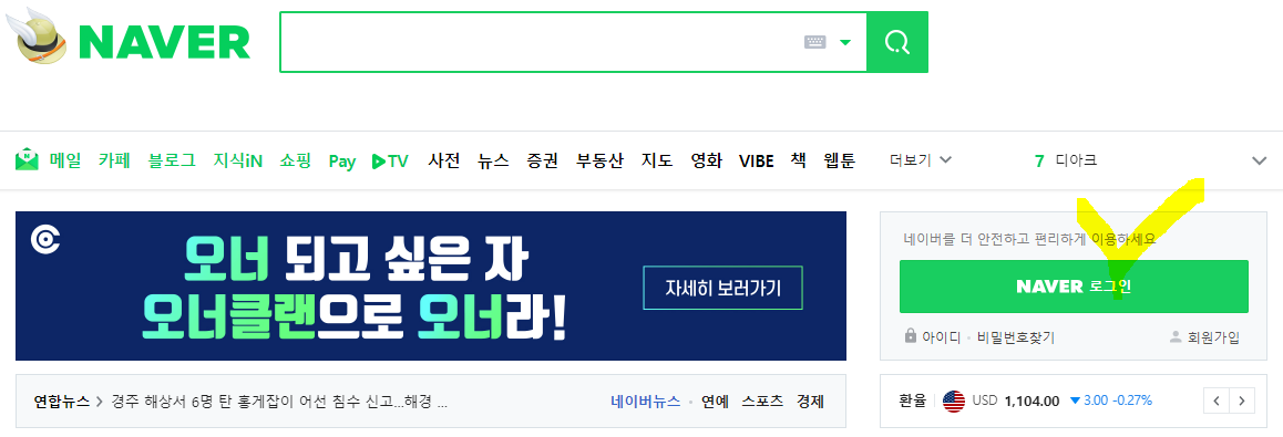 로그아웃 되면 아래 보이시는 바와 같이 "NAVER 로그인"으로 바뀌어 있는 것을 보실 수 있습니다.