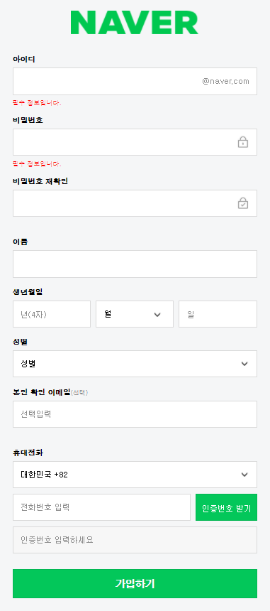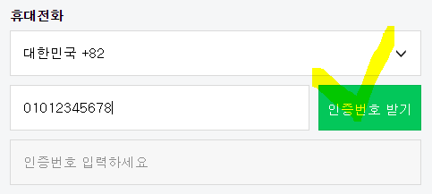 본인 휴대전화 번호를 입력하고 "인증번호 받기"를 클릭한 후 휴대전화에 수신된 문자를 통해 인증번호를 확인해서 입력합니다. 그리고 '가입하기' 버튼을 최종 클릭해줍니다.