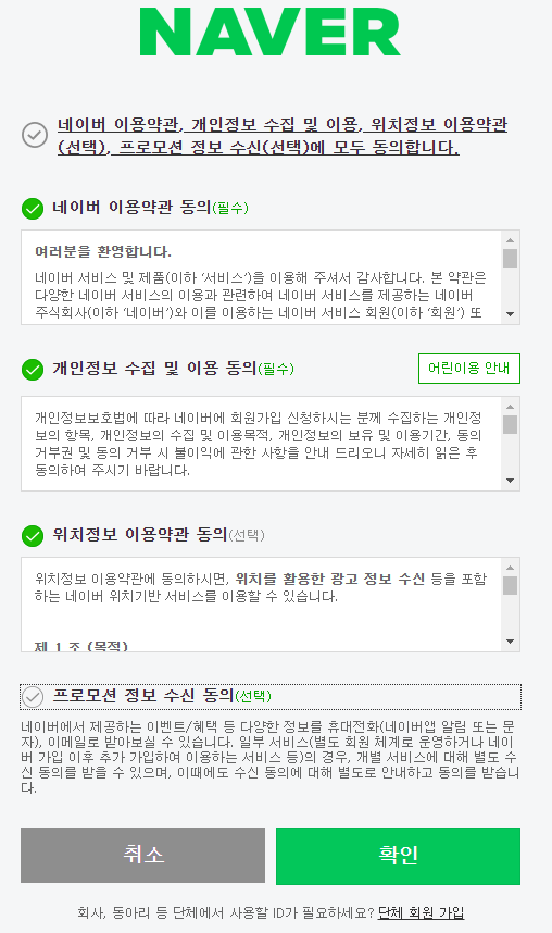 네이버 이용약관 동의, 개인정보 수집과 위치정보 이용에 관한 동의 관련 내용인데요, 저는 프로모션 정보 수신 동의만 제외하고 나머지 항목들은 모두 선택해주었습니다.