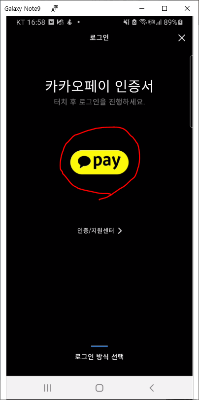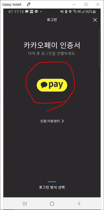 가운데 카카오페이 PAY 아이콘을 클릭해서 로그인을 시도하고 카카오페이 pay 지문인증을 합니다.