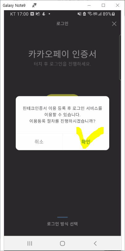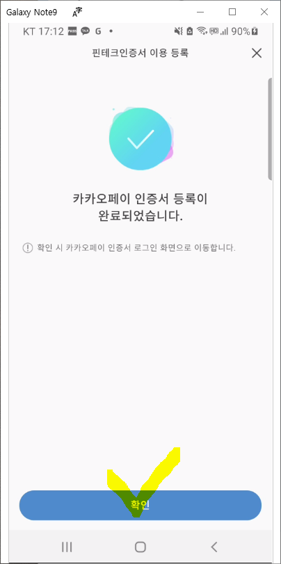 이제 핀테크 인증서 이용 등록을 통해서 "카카오페이 인증서 등록이 완료되었습니다." "확인"을 눌러줍니다.