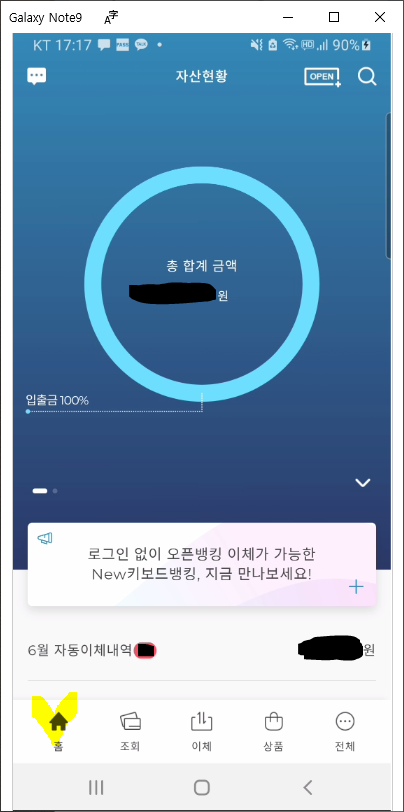 아 드디어 로그인이 정상적으로 완료되었습니다. 로그인 후 첫 화면은 홈 화면이며 자산현황이 총합계금액으로 표시되는 화면이 조회되고 있습니다.