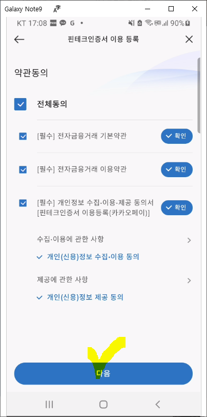 약관 동의에서 모두 필수항목이라 전체 동의를 하고, 해당 약관이 차례대로 보일 때마다 "확인" 버튼을 눌러주시면 됩니다. 약관을 하나씩 모두 확인했으면 "다음"으로 넘어갑니다.