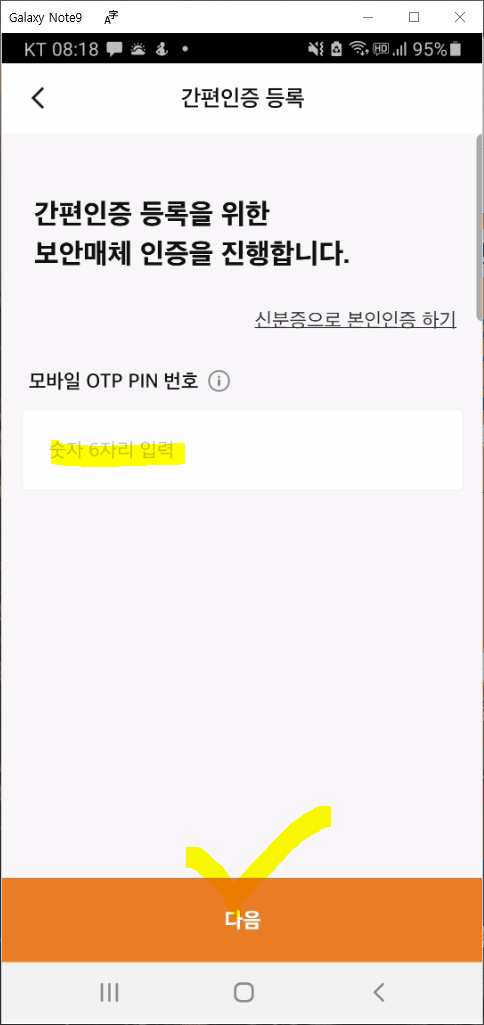 핸드폰으로 문자가 전송되면 수신한 6자리 인증번호를 입력하고 "다음"을 눌러 넘어갑니다.