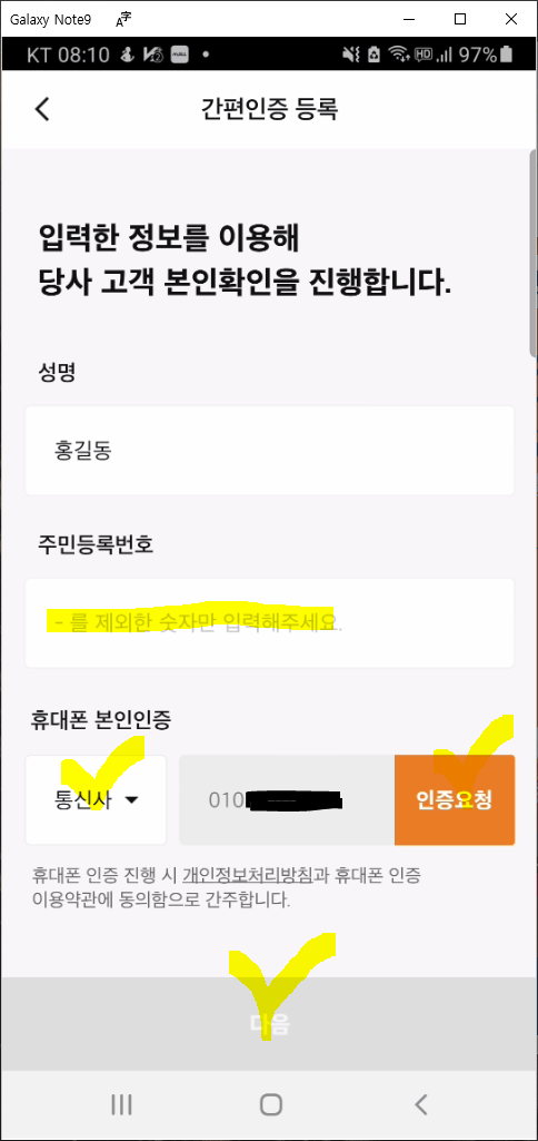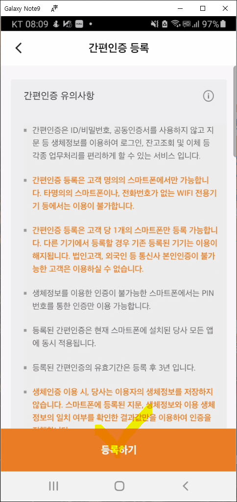 - 간편 인증 유의사항 --> 등록하기 클릭