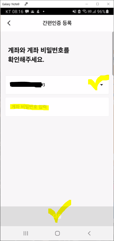 다음은 계좌와 계좌 비밀번호를 확인해주는 화면입니다. 계좌번호를 선택하고 계좌 비밀번호를 입력한 후 "다음"을 클릭해야 합니다.