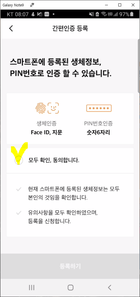 간편인증 등록 화면에서는 "모두 확인, 동의합니다."를 체크하고 간편 인증 유의사항을 보고 "등록하기"를 눌러줍니다.