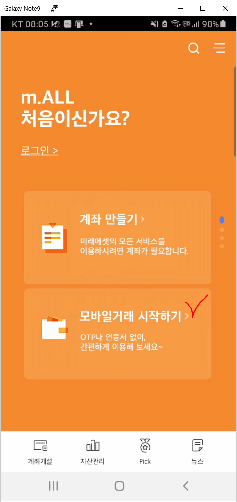 핸드폰에 설치된 미래에셋 계좌 개설용 모바일 앱(m.ALL)을 실행하고 모바일 거래 시작하기 부분을 클릭합니다.