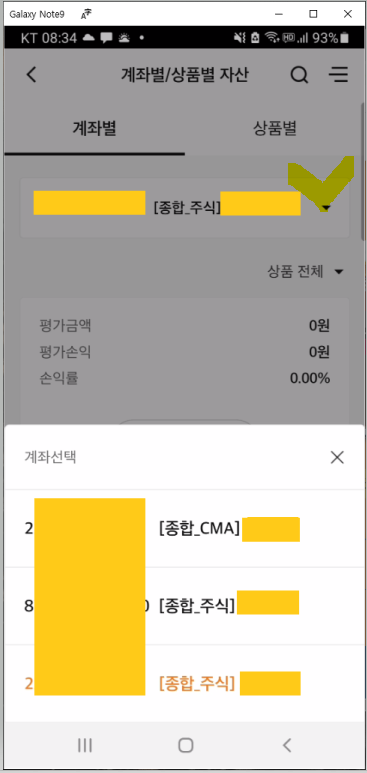 자산현황의 화면은 계좌별 탭(Tap)과 상품별 탭 2개의 탭으로 구성되어 있습니다. 아래 화면에서 CMA 계좌 1개와 주식 계좌 2개가 보이는데요. 개설된 계좌를 하나씩 선택해서 각 계좌의 평가금액, 평가손익, 손익률 등을 조회해볼 수 있습니다.