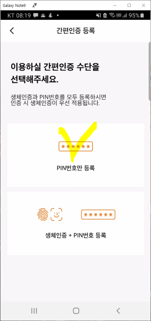 이용하실 간편인증 수단을 선택해주세요. 화면에서 저는 "PIN번호만 등록"을 선택했습니다.