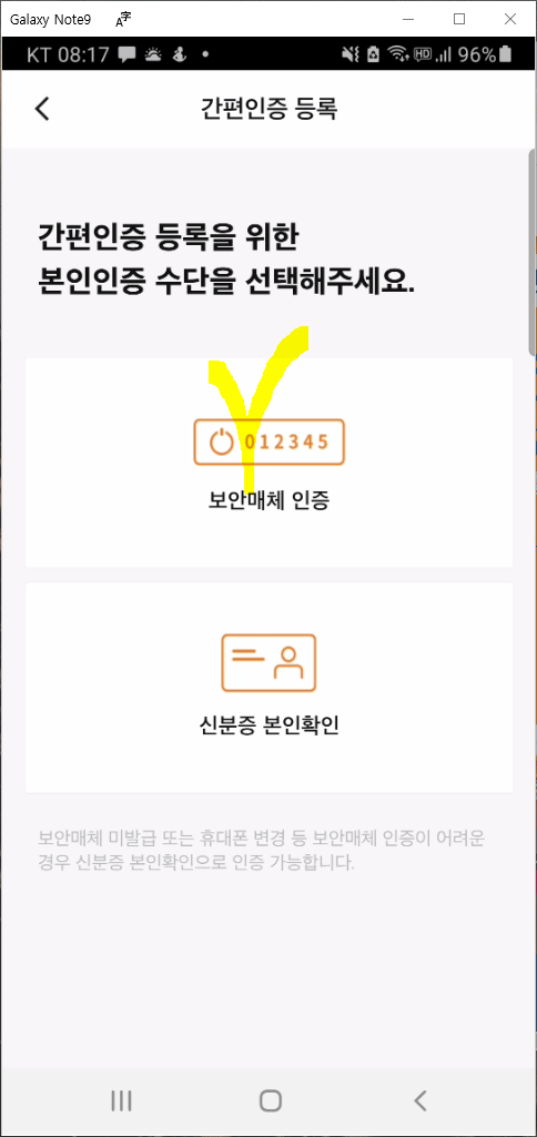 - 간편 인증 등록 본인인증 수단 선택 : 보안매체 인증 또는 신분증 본인 확인