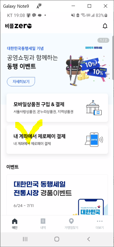 - 실행된 제로페이 앱 첫 화면 가운데 보이는 "내 계좌에서 제로페이 결제"를 클릭합니다.