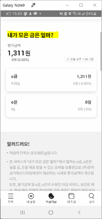 모은 금이 e금으로 몇 g인지 원화 환산금액은 얼마나 되는지 실시간으로 바로 확인하실 수 있습니다.