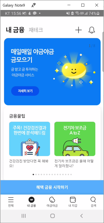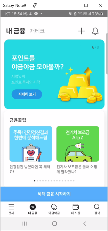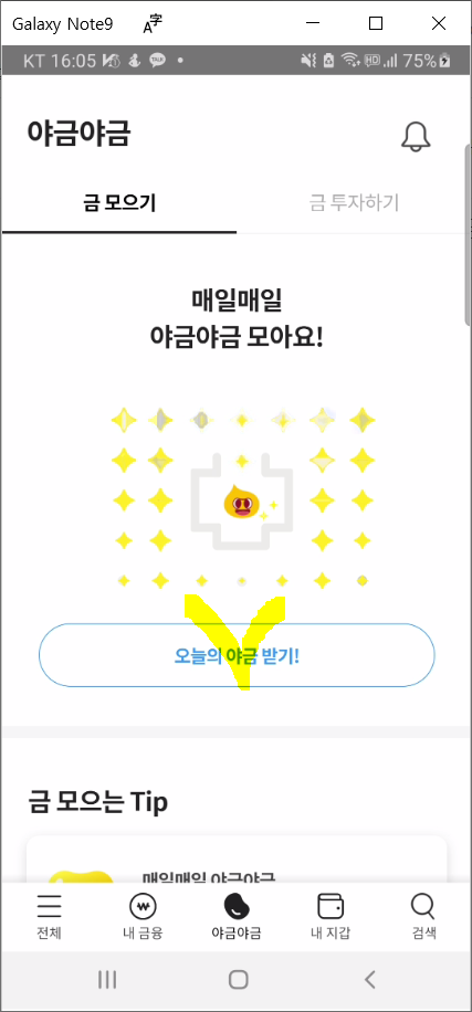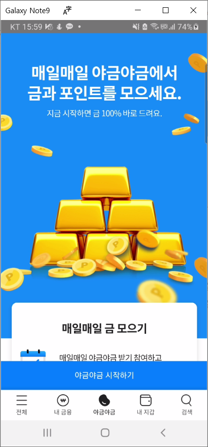 시럽에서 내 금융 메뉴를 클릭하면 상단에 이벤트 중에서 "포인트를 야금야금 모아볼까?"라는 내용이 보이는데요. "매일매일 야금야금 금모으기" 도대체 어떤 내용인지 궁금해서 자세히 보기를 클릭해서 바로 확인해보도록 하겠습니다. 야금야금 메뉴는 내 금융 이벤트를 통해 가셔도 되고, 모바일 앱 하단에 "야금야금"이라고 바로 보이기 때문에 바로 눌러서 이동하셔도 됩니다.