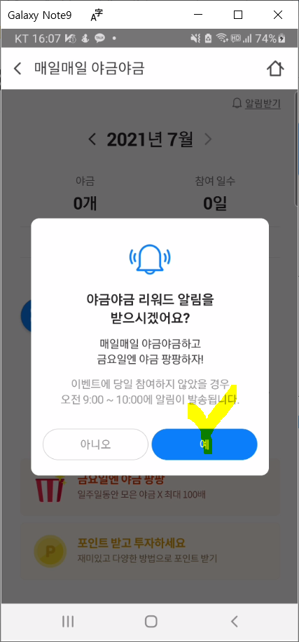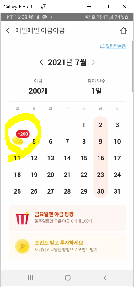 먼저 오늘의 야금받기를 눌러보겠습니다. 오늘 바로 +200로 표시되는데요. 그 의미는 야금 200개를 받으셨다는 뜻입니다. 또한 리워드 알림을 받으시려면 알림을 받으시겠어요?라는 팝업(Pop-up) 화면에 "예"를 클릭해주시면 됩니다.