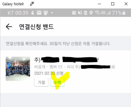 다음과 같이 연결신청 밴드라는 타이틀로 조회되는데요 연결신청을 하는데 30일이 지난 신청은 자동 거절된다고 하니 그 안에는 거절할지 수락할지 결정을 해야되는 것 같습니다.