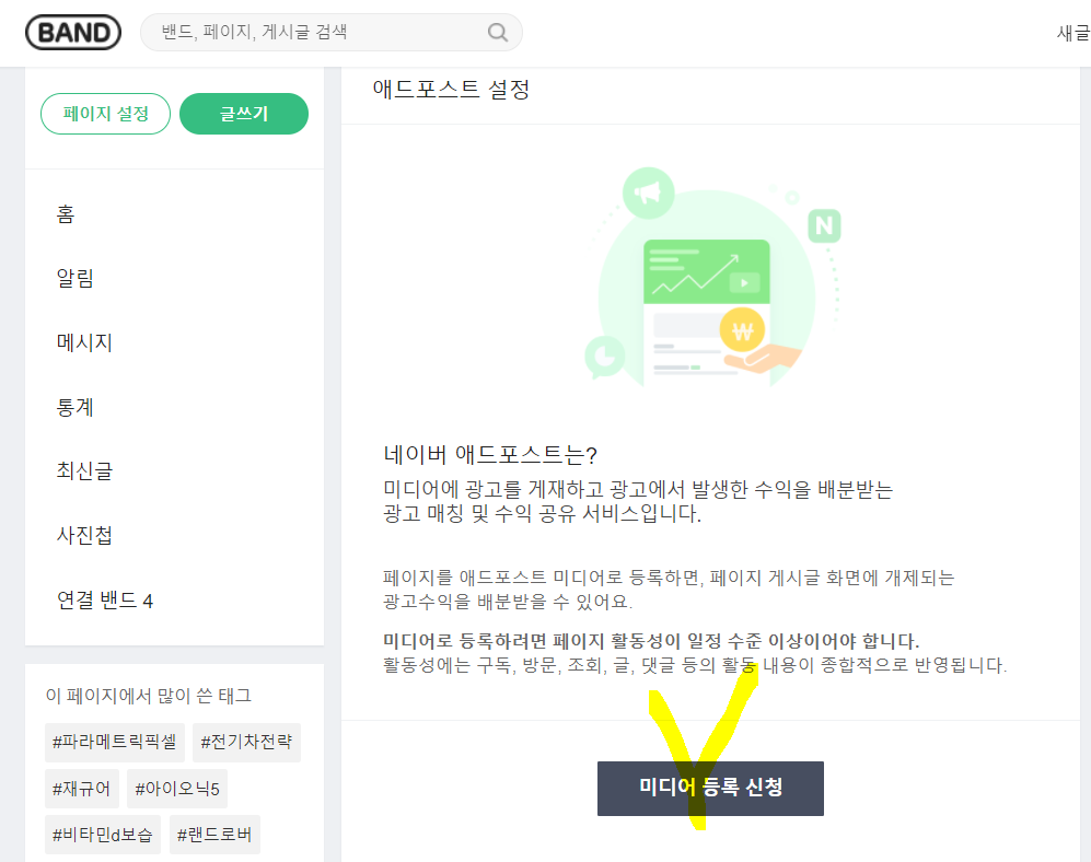 밴드 페이지 애드포스트 미디어 등록 완료