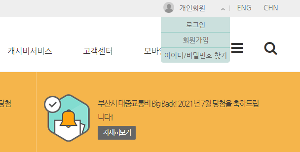 캐시비 회원가입을 완료하고 홈페이지에 정상 로그인이 잘 되는지 확인합니다.
